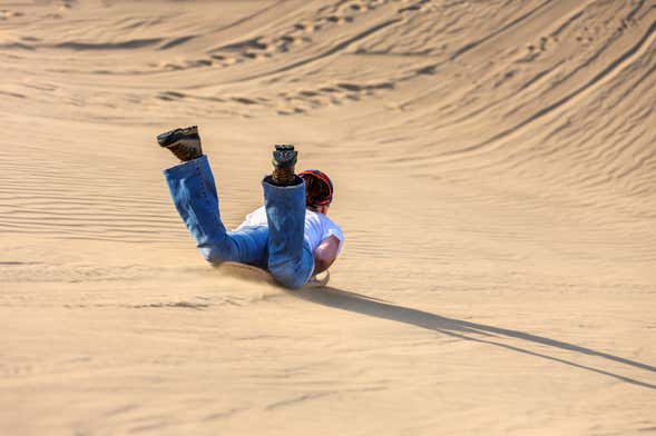We arrive at the impressive sand dunes of Tifnit, in the Sahara Desert in Agadir, where our sandboarding activity will take place. This relatively unknown sport involves riding specially designed boards down the sand hills. This is like surfing without water!