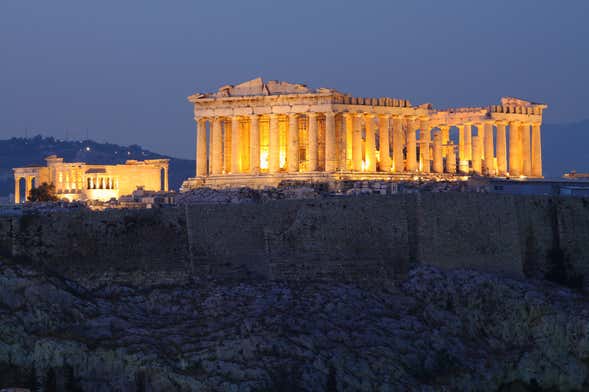 Behind the mosque lie the remains of the ancient library of Hadrian, the second Hispanic emperor in history. Next to this important archaeological site, we'll enjoy beautiful views of the Acropolis of Athens. The illumination of its main monuments (the Parthenon, the Propylaea, and the Erechtheion, among others) allows us to admire these remnants of ancient times in different parts of the Greek capital.