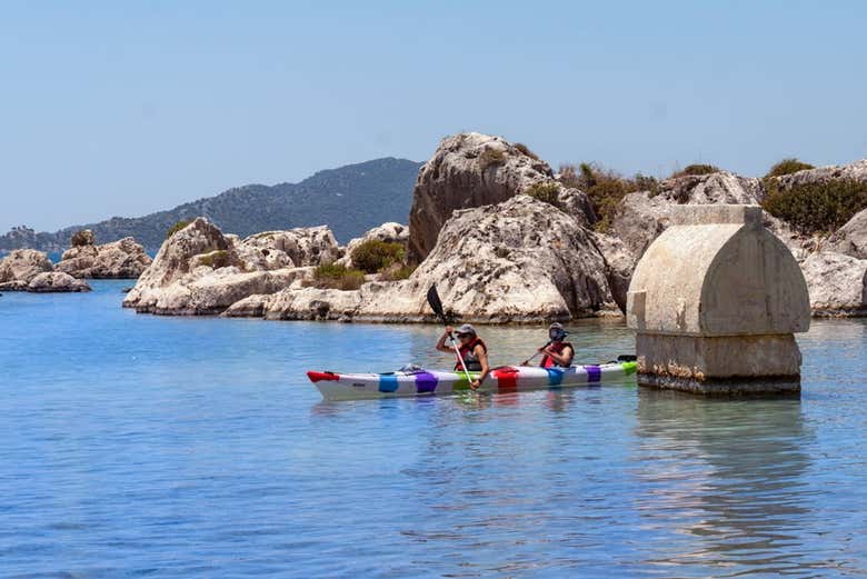 After 45 minutes, we'll reach the coastal town of Uçağiz, where we'll head over to the kayaks, paddles, and life vests. Once we're ready with all the necessary equipment, we'll begin an exciting kayak tour of the most beautiful spots along the Turquoise Coast, in the south of Turkey.