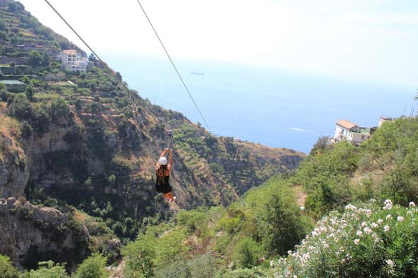 We'll fly over the hills of Furore at full speed for about 30 minutes. The zip line will take us to the town of Conca dei Marini, offering incredible views of the Tyrrhenian Sea and the small towns that stretch along the Amalfi Coast. You'll be amazed!