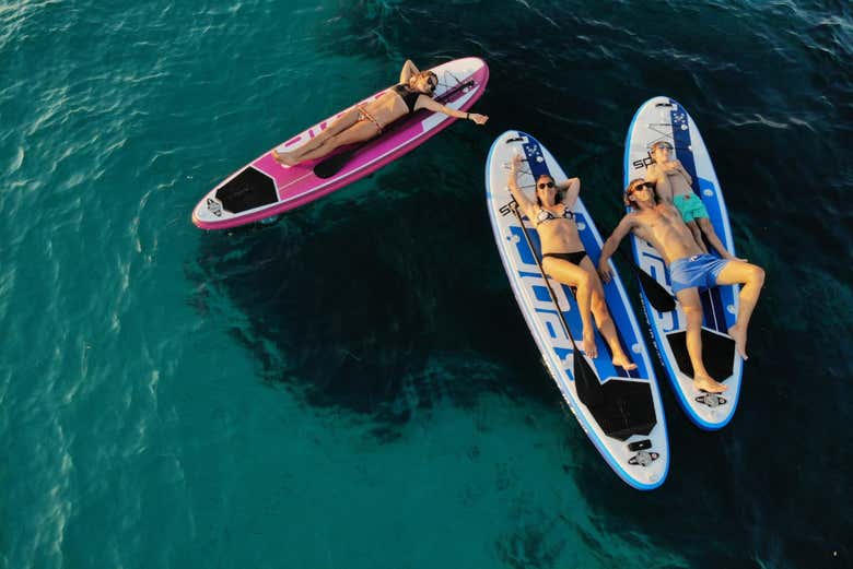 Following a brief safety introduction, we'll take to the water to kick off our exciting paddle boarding experience in Cala Blava. First, we'll paddle along the shoreline of Calo de Sse Lleonardes Beach. Then, we'll continue navigating towards Palma Bay and enjoy stunning panoramic coastal views.