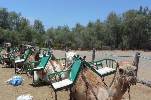 Our camel ride of around 30 minutes, starts at the beautiful Maspalomas lagoon. We'll climb up onto the shoulders of these animals with unique features that allow them to perfectly adapt to hot, dry conditions. Then we're ready to head into the Maspalomas Nature Reserve.