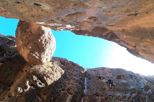 During the climbing activity in Los Loros Gorge, we'll climb on vertical rock walls between 12 and 15 meters (40-50 feet) high. The level can be adapted according to the previous experience of the group.