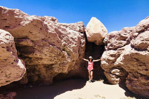 First of all, we'll the 4x4 will take us to the top of a hill to get magnificent panoramic views of the Atacama Desert. After enjoying the views, we'll embark on a trekking route through the Salto del Chintaguay gorge. In this medium-difficulty hike, we'll cover about 2 kilometers (1.25 miles).