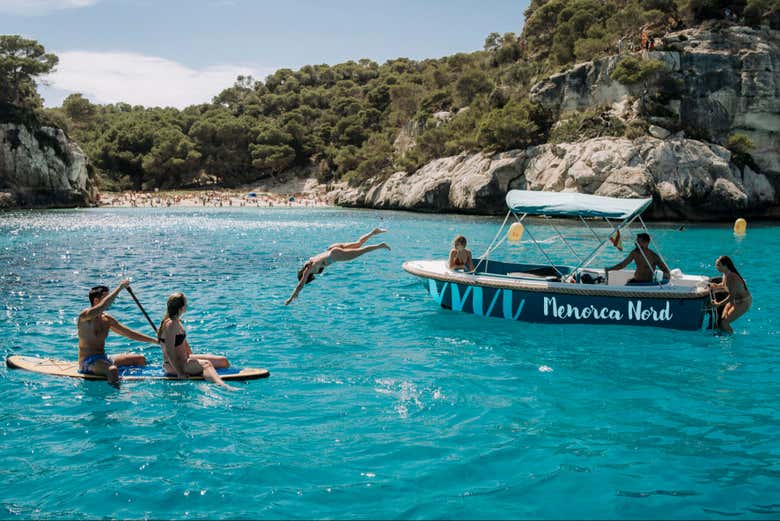 Once we're all ready, you'll board the boat equipped with a cooler, awning, solarium and a ladder to sail freely along the north coast of Menorca. In this area of the island, you'll be surrounded at all times by golden cliffs and turquoise waters. Take as much time as you need to take photos of the amazing views!