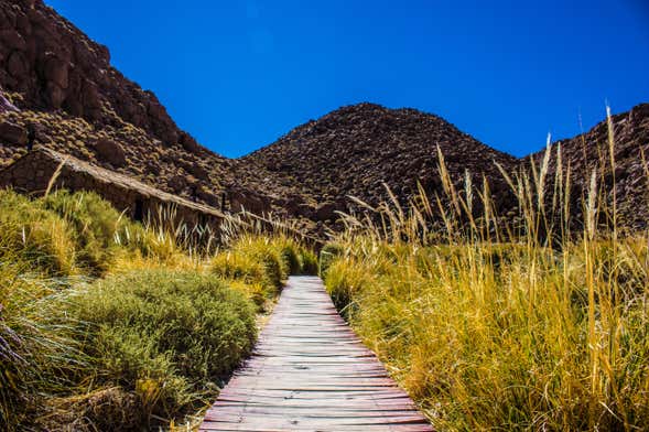 We'll collect you from your hotel in the centre of San Pedro de Atacama at your chosen time and then start driving south. After around 30 minutes, we'll reach a canyon with a stream of natural thermal water.