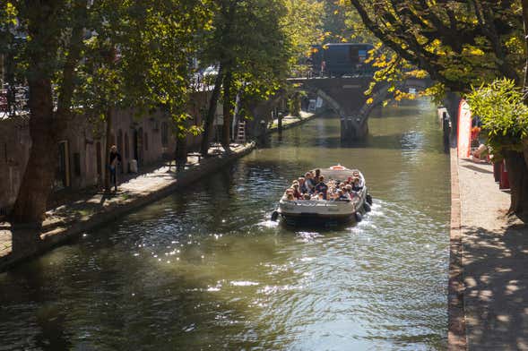 First, we'll sail along the Oudegracht, which not only gives its name to the former street, but also to the so-called old canal of Utrecht. This iconic waterway crosses the old part of the city, so we'll see the profile of St. Martin's Cathedral from the boat. Next to it, we'll see the imposing Dom tower. Did you know that it's the tallest bell tower in the Netherlands? The guide on board will tell you many interesting facts about this landmark.