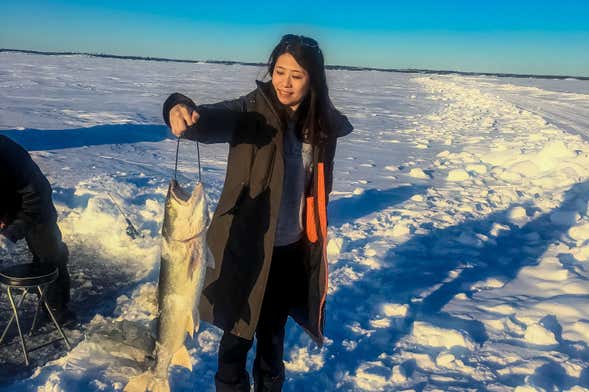 During the experience, you will hear about the different kinds of fish that live in the Great Slave Lake, such as salmon, rainbow trout, and pike. At the end of the activity, we will enjoy a tasty light lunch and try some of the fish we have caught, accompanied by some delicious hot drinks to warm us up.