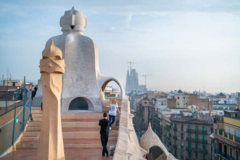 Por último, subiremos hasta la Azotea de los Guerreros, donde nos esperan las famosas chimeneas que representan a los guerreros y guardianes de La Pedrera. Además, desde aquí, tendréis unas vistas impresionantes de la Ciudad Condal.