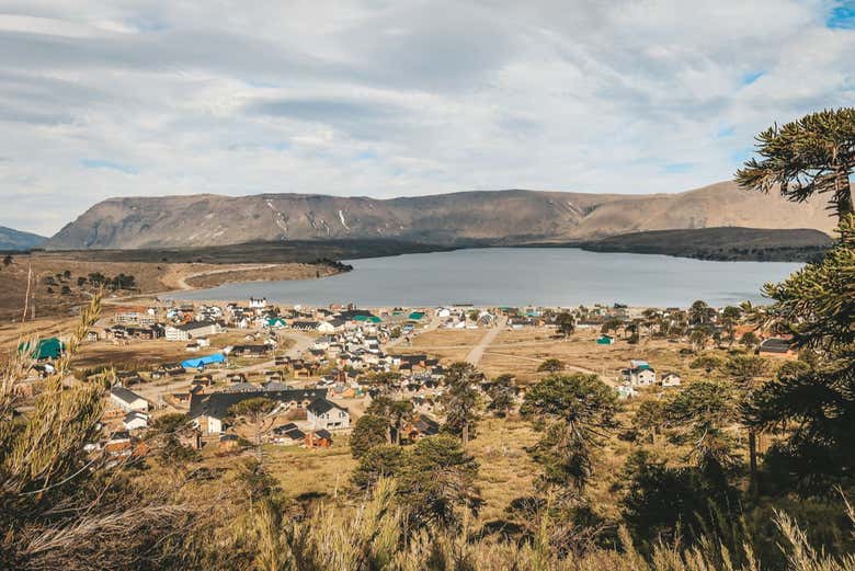 Una vez lleguemos al punto más alto, lograremos ver el lago. Avanzaremos y estaremos rodeados de un imponente paisaje engalanado por las montañas y el volcán Copahue. La panorámica se completará con las casitas desperdigadas de la villa frente a la laguna Escondida. ¡El momento perfecto para disfrutar de una reconfortante bebida caliente!