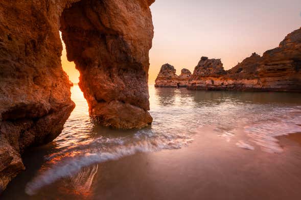 Conforme el sol comience a esconderse, saldremos del puerto de Lagos para navegar junto a la escarpada costa de Ponta da Piedade, pasando por estrechos pasajes como los Siamesas, el Arco del Triunfo y el Corredor. Mientras surcamos las olas del mar, descubriremos cómo el color anaranjado del atardecer hace que las formaciones rocosas de esta zona sean aún más espectaculares. Además, veremos cómo el ocaso alcanza el interior de algunas de las cuevas más famosas de la región, como Sala, Catedral, Cozinha y la Calavera.