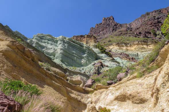 Empezaremos a caminar por un paraje semidesértico admirando los vivos colores verdosos y rojizos del monumento natural de los Azulejos de Veneguera. Veremos cómo las montañas parecen haber sido decoradas por delicadas pinceladas y os contaremos cómo se creó este paisaje tras las erupciones del volcán de Tejeda.