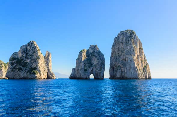 De vuelta al barco, haremos un recorrido alrededor de la isla para ver algunos de sus principales atractivos. Veremos las famosas rocas Faraglioni, el Arco del Amor y, si las condiciones del mar lo permiten, cuevas marinas como la Gruta Verde o la Gruta Blanca. Todos ellos, monumentos naturales de origen kárstico. De hecho, Capri es de las pocas islas no volcánicas del golfo de Nápoles. Curioso, ¿verdad?