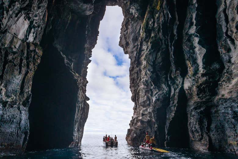 Continuaremos nuestro recorrido hacia el faro de Ribeirinha, y en esta parte de la travesía navegaremos entre impresionantes cuevas esculpidas por las erupciones volcánicas y visitaremos el antiguo puerto de Santa Iria. También pasaremos frente a la playa de los Molinos, donde os podréis bañar y disfrutar de un ambiente tranquilo y relajante.