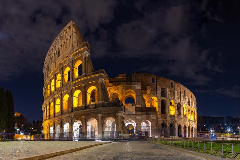 Durante el recorrido, exploraremos los lugares más emblemáticos de la Ciudad Eterna mientras brillan en la noche. Desde el punto de encuentro, iremos en autobús hasta el Coliseo, donde os maravillaréis ante este majestuoso anfiteatro romano iluminado. ¡Os transportará a los tiempos del Imperio Romano!