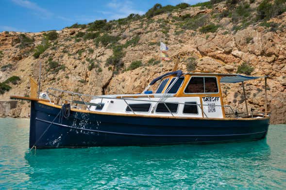 Zarparemos a bordo de un llaut, una embarcación típica ibicenca en la que podréis relajaros mientras tomáis el sol y contempláis la costa de la isla. En primer lugar, pasaremos por la playa de Port des Torrent, un puerto natural de aguas tranquilas repleto de casas varadero.