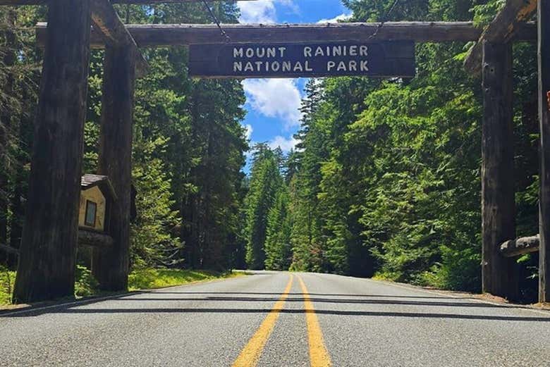 ¿Primera parada? Federation Forest State Park, donde durante media hora recorreremos un breve sendero envuelto en bosques cubiertos de musgo y árboles centenarios, respirando la humedad y frescura del entorno. Llegará el momento de entrar al Parque Nacional Monte Rainier. Allí haremos una pausa de 15 minutos para capturar la icónica fotografía junto al cartel de entrada.