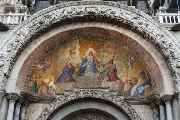 Si elegís esta opción, tendréis acceso rápido y disfrutaréis de una visita guiada de la planta baja de la Basílica de San Marcos. Al entrar por los grandes portales de esta icónica catedral, veréis los relucientes mosaicos dorados que abarcan más de 8000 metros cuadrados y representan escenas bíblicas e historias del pasado histórico de Venecia.