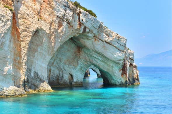 Navegaremos por el agua cristalina que rodea a esta formación rocosa, adentrándonos en las hermosas cuevas, que, gracias al reflejo del agua, toman unas tonalidades azules que hacen de este paraje uno de los más especiales de toda Grecia.