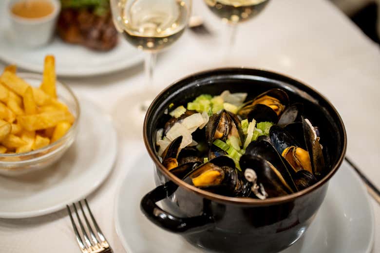 - Cozze alla birra Lambic Boon con patatine fritte belghe.