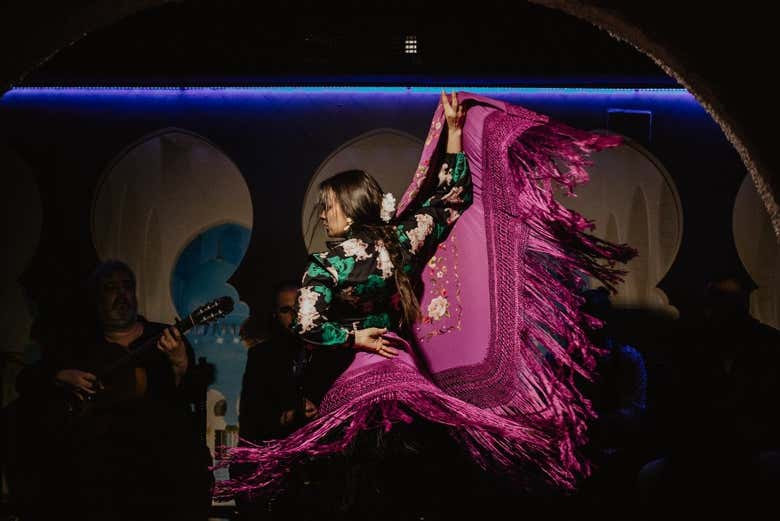 Una volta arrivati al locale, potrete sedervi ai tavoli accanto al palco, dove inizieranno a suonare i primi accordi della chitarra spagnola e i ritmi del tamburo cajon. Che emozione! I cantanti vi trasmetteranno emozioni profonde attraverso le loro voci, trasportandovi nell'autentica essenza del flamenco.
