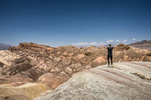 Una volta lì, realizzeremo varie fermate per osservare le migliori viste panoramiche del parco e, durante l'itinerario, saliremo fino a 1500 metri d'altezza per contemplare la valle dal belvedere Dante's View. Nella stessa giornata, però, scenderemo anche a 100 metri sotto il livello del mare per scoprire le saline di Badwater. Sapevate che più di 2000 anni fa qui c'era un lago?