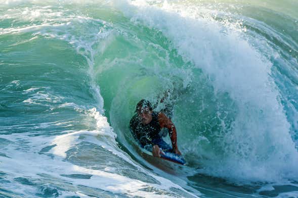 Il bodyboard è simile al surf e consiste nel cavalcare le onde sdraiati. Per questo motivo, le tavole sono un po' più piccole e più leggere di quelle utilizzate nel surf. Vi insegneremo come utilizzare tutta l'attrezzatura necessaria sulla spiaggia di Nazaré, dove realizzeremo anche alcuni semplici esercizi di riscaldamento.