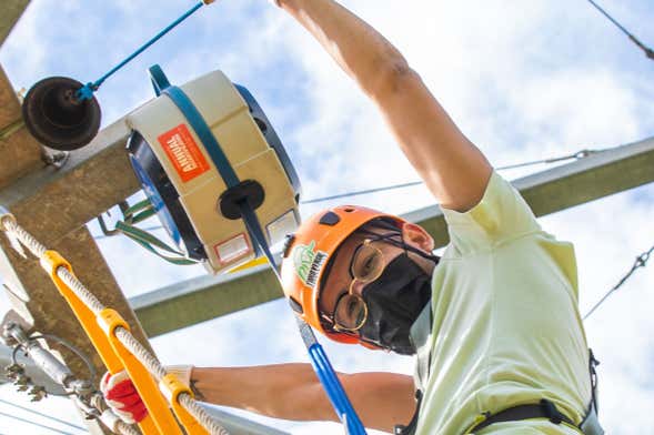 La nostra avventura sul Toro Roller inizierà con la salita su una torre alta 18 metri, da cui ammirerete una vista impressionante sulla vegetazione di Orocovis. Da questo punto, indosseremo l'attrezzatura di sicurezza e inizieremo il circuito.